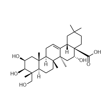 Polygalacic acid, is a triterpene, isolated from the root of Polygala tenuifolia Willd. Polygalacic acid inhibits MMP expression. Polygalacic acid may have a therapeutic effect in Osteoarthritis (OA) treatment [1]. Polygalacic acid exerts a significant neuroprotective effect on cognitive impairment, PA improves cholinergic system reactivity by inhibiting acetylcholinesterase (AChE) activity, increasing choline acetyltransferase (ChAT) activity, and elevating levels of acetylcholine (Ach) in the hippocampus and frontal cortex[2]. In Vitro: Polygalacic acid (0-100 μM; 24 hours) significantly decreases the mRNAexpressions of MMP-3, MMP-9, MMP-13, and COX-2, which are significantly increased by IL-1β, in a dose-dependent manner[1]. Polygalacic acid (0-100 μM; 6 hours) decreases the expression of phosphor-p38, phosphor-Erk, and phosphor-Jnk induced by IL-1β, phosphor-p65 is not reduced by polygalacic acid[1].