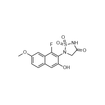 Tegeprotafib (PTPN2/1-IN-1) (Compound 124) is an orally active PTPN1 and PTPN2 inhibitor with IC50s of 4.4 nM and 1-10 nM against PTPN2 and PTP1B, respectively[1]. IC50 & Target:IC50: 4.4 nM (PTPN2), 1-10 nM (PTP1B)[1] In Vitro: Tegeprotafib (Compound 124; 5 days) inhibits IFNγ (0.5 ng/mL) induced B16F10 cellular growth with a percent growth inhibition of 60-90% at 33 μM[1]. In Vivo: Tegeprotafib (Compound 124; 300 mg/kg; oral; BID for 21 days) shows antitumor activity in mice[1].