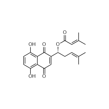 β,β-Dimethylacrylshikonin (Isoarnebin I) is a naphthoquinone derivative that can be isolated from Lithospermum erythrorhizon Sieb. et Zucc. β,β-Dimethylacrylshikonin promotes angiogenesis by inducing eNOS, VEGF and HIF-1α expression through the PI3K-dependent pathway. β,β-Dimethylacrylshikonin inhibits Notch-1 activation. β,β-Dimethylacrylshikonin inhibtis tumor cell proliferation, induces tumor cell apoptosis, and inhibits tumor growth[1][2][3][4].