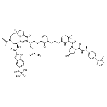 KT-333 is a molecular glues that degrades STAT3 protein. KT-333 mediates the selective degradation of STAT3 through the ubiquitin-proteasome system by binding to STAT3 protein and E3 ubiquitin ligase von Hippel-Lindau protein (VHL). KT-333 has strong selectivity for STAT3 protein degradation and good antitumor activity. KT-333 can be used in the study of hematologic malignancies such as large granular lymphocytic leukemia (LGL-L), peripheral T-cell lymphoma (PTCL), and cutaneous T-cell lymphoma (CTCL)[1].