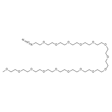 m-PEG16-azide is a PEG-based PROTAC linker that can be used in the synthesis of PROTACs[1]. m-PEG16-azide is a click chemistry reagent, it contains an Azide group and can undergo copper-catalyzed azide-alkyne cycloaddition reaction (CuAAc) with molecules containing Alkyne groups. It can also undergo strain-promoted alkyne-azide cycloaddition (SPAAC) reactions with molecules containing DBCO or BCN groups. In Vitro: PROTACs contain two different ligands connected by a linker; one is a ligand for an E3 ubiquitin ligase and the other is for the target protein. PROTACs exploit the intracellular ubiquitin-proteasome system to selectively degrade target proteins[1].