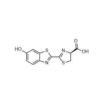D-luciferin is the natural substrate of the enzyme luciferase (Luc) that catalyzes the production of the typical yellowgreen light of fireflies. The 560 nm chemiluminescence from this reaction peaks within seconds, with light output that is proportional to luciferase concentration when the substrate luciferin is present in excess. The luciferase (luc) gene is a popular reporter gene for research and agent screening. Chemiluminescent techniques are virtually background-free, making the luc reporter gene ideal for detecting low-level gene expression. As little as 0.02 pg of luciferase can be reliably measured in a standard scintillation counter. In addition to its role as a reporter of gene expression, luciferase is commonly used in an extremely sensitive assay for ATP[1]. We of er the firefly luciferase (HY-P1004), luciferin free acid (HY-12591A), as well as its water-soluble sodium salts (HY-12591) and potassium salts (HY-12591B) .