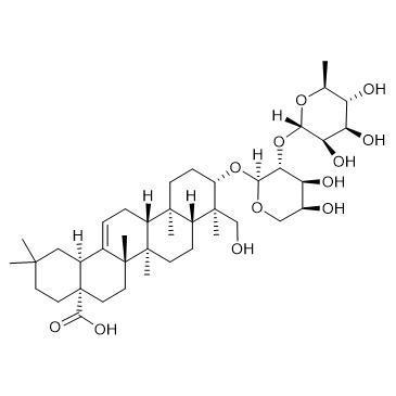 alpha-Hederin (α-Hederin), a monodesmosidic triterpenoid saponin, exhibits promising antitumor potential against a variety of human cancer cell lines. alpha-Hederin could inhibit the proliferation and induce apoptosis of gastric cancer accompanied by glutathione decrement and reactive oxygen species generation via activating mitochondrial dependent pathway[1]. In Vitro: alpha-Hederin (α-Hederin) is cytotoxic and inhibits proliferation in both cel lines at rather low concentrations. alpha-Hederin (α-Hederin)reduces the mitotic activity in treated cells[2]. In Vivo: alpha-Hederin (α-Hederin) has preventive effect on sensitized rats like thymoquinone. It may intervene in miRNA-126 expression, which consequently could interfere with IL-13 secretion pathway leading to a reduction in inflammatory responses[3].