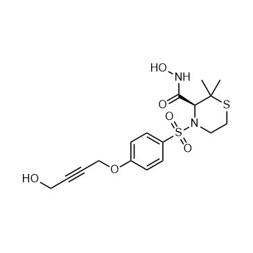 Apratastat (TMI-005) is an orally active, non-selective and reversible TACE/MMPs inhibitor, can inhibit inhibit the release of TNF-α. Apratastat has the potential to overcome radiotherapy-resistance in non-small cell lung cancer (NSCLC)[1][2]. Apratastat is a click chemistry reagent, it contains an Alkyne group and can undergo copper-catalyzed azide-alkyne cycloaddition (CuAAc) with molecules containing Azide groups. In Vitro:Apratastat (10 μM, 24 hours) inhibits expression of pro-inflammatory cytokines TNF-α and IL-6 in lung tissue samples[3]. Apratastat (10 μM, 24 hours) reduces ADAM17 activity and MCAM release in HUVEC[4]. In Vivo:Apratastat (10 mg/kg, i.p., administered twice at 4 and 16 hours post-induction) alleviats lung inflammation induced by Poly(I ) (HY-119307) and SARS-CoV-2 RBD-S protein in C57BL/6 mice[3]. Apratastat (10 mg/kg, p.o., once daily for 14 days) exhibits anti-tumor and anti-angiogenic activity in the MC38 xenograft C57BL/6 mouse model[4].