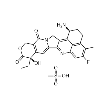 (1S,9R)-Exatecan mesylate ((1S,9R)-DX8951f) is an isomer of Exatecan mesylate (HY-13631A). Exatecan mesylate (DX8951f) is an inhibitor of DNA topoisomerase I with an IC50 of 2.2 μM (0.975 μg/mL) and can be used in cancer research[1].