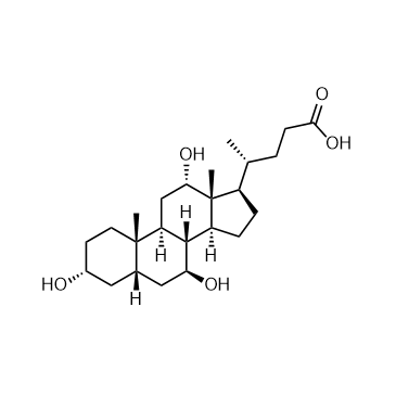 Ursocholic acid, a bile acid present in mammalian bile, is converted to deoxycholic acid (UDC) by the mouse intestinal flora. Ursocholic acid acts as a gallstone dissolving agent in the liver through anti-apoptosis, anti-inflammatory, immunomodulatory, bile regulation, and coordinated changes in mitochondrial integrity and cell signaling, Ursocholic acid also has favorable effects on bones in patients with chronic cholestasis[1][2][3][4][5]. IC50 & Target:7α-hydroxysteroid dehydrogenase[1], hepatocyte nuclear factor 1α[2]. In Vitro:Ursocholic acid (1 μM, 10 μM, 100 μM and 1 mM, 24-72 h) has no deleterious effect on osteoblast survival at a lower concentration (100 μM), increases osteoblast differentiation treated with LCA (10 μM), and neutralizes the deleterious effects of bilirubin (50 μM)[5]. Ursocholic acid (1 μM, 10 μM and 100 μM, 7-28 days) increases osteoblast mineralization by 35% and 9% at days 21 and 28 at a dose of 100 μM[5]. In Vivo:Ursocholic acid (10, 100 and 500 mg/kg, i.g.; once daily for 6 days) reduces significantly inflammatory cytokine levels and intestinal villus damage in Sprague-Dawley rats[4].