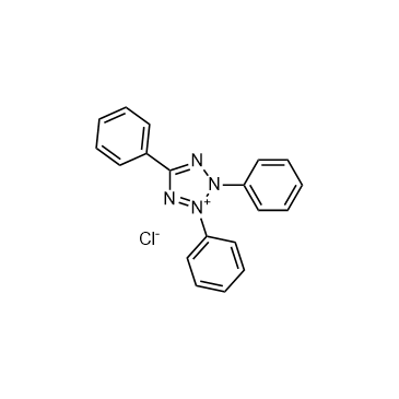 Tetrazolium Red (2,3,5-Triphenyltetrazolium chloride; TTC) is a not brain-penetrant, colorless, water-soluble dye that is reduced by mitochondrial enzymes to a deep red, water-insoluble compound (formazan) mainly in the mitochondria of living cells. Tetrazolium Red is used to observe the activity of dehydrogenase, and it turns colorless to red when exposed to hydrogen. Tetrazolium Red distinguishes between surviving and infarcted brain tissue after stroke. Tetrazolium Red has been used to stain heart tissue to measure the extent of acute lesions and also used to stain brain tissue to detect the size of the infarcted area. The absorption wavelength of Tetrazolium Red is 570 nm[1][2][3][4].