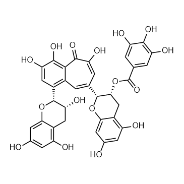 Theaflavin-3-gallate, a black tea theaflavin monomer, is regarded as the biologically important active component of black tea and provides health benefits. Theaflavin-3-gallate acts as prooxidants and induces oxidative stress in the carcinoma cells. Theaflavin-3-gallate reacts directly with reduced glutathione (GSH) in a time- and concentration-dependent manner. Theaflavin-3-gallate induces apoptosis and G1 cell cycle arrest in ovarian cancer A2780/CP70 cells through p53-dependent pathways. Theaflavin-3-gallate induces DNA damage through ATM/Chk/p53 pathway[1][2].