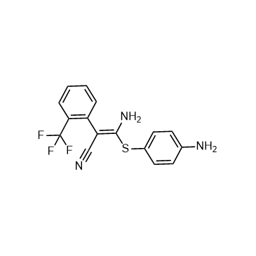 SL327 inhibits MEK1 and MEK2, with IC50 values of 180 nM and 220 nM, respectively. IC50 & Target: IC50: 180 nM (MEK1), 220 nM (MEK2)[1] In Vitro: The specificity of SL327 for MEK is investigated. Kinase activity is assessed by measuring the incorporation of [32P]phosphate during phosphorylation of substrate peptides specific for each kinase. Although SL327 inhibits MEK with an IC50 of 0.27 μM, 10 μM SL327 has no significant effect on PKA, CaMKII, or PKC[2]. In Vivo: SL327, which crosses the blood-brain barrier, is administered intraperitoneally at several concentrations to animals prior to cue and contextual fear conditioning. Administration of SL327 completely blocks contextual fear conditioning and significantly attenuates cue learning when measure 24 hr after training. Animals treated with SL327 exhibit significant attenuation of water maze learning; they take significantly longer to find a hidden platform compared with vehicle-treated controls and also fail to use a selective search strategy during subsequent probe trials in which the platform is removed. Mice are injected with various concentrations of SL327 (10, 30, 50 mg/kg i.p.), and 1 hr later their hippocampi are removed and assayed for activated MAPK. SL327 attenuates phosphorylated MAPK levels in a dose-dependent manner. Administration of 10, 30, or 50 mg/kg SL327 significantly attenuates p42 phospho-MAPK levels (F=20.90, P<0.0001;10 mg/kg SL327 vs. vehicle, P<0.05, and 30 and 50 mg/kg SL327 vs. vehicle, P<0.001). Injection with 30 or 50 mg/kg SL327 also significantly reduces p44 phospho-MAPK levels (F=5.627, P<0.005;30 mg/kg vs. vehicle, P<0.05, and 50 mg/kg SL327 vs. vehicle, P<0.01)[2].