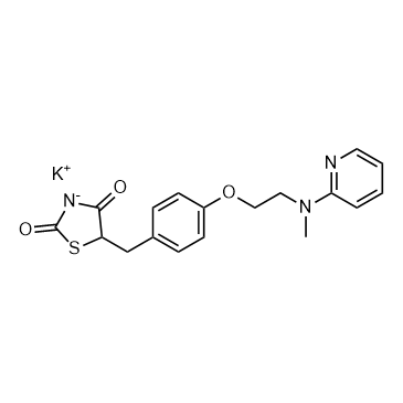 Rosiglitazone (BRL 49653) potassium is an orally active selective PPARγ agonist (EC50: 60 nM, Kd: 40 nM). Rosiglitazone potassium is a TRPC5 activator (EC50: 30 μM) and TRPM3 inhibitor. Rosiglitazone potassium can be used in the research of obesity and diabetes, senescence, ovarian cancer[1][2][4][7].