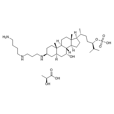 Squalamine lactate is an aminosterol compound discovered in the tissues of the dogfish shark, with antimicrobial activity, and used for the treatment of neovascular age-related macular degeneration. In Vitro: Squalamine lactate has a more generalized effect on the cellular signaling cascade that is common to both VEGF and other growth factors[1]. Squalamine blocks the action of VEGF and integrin expression, thereby inhibiting angiogenesis, when bound to calmodulin[2]. In Vivo: Squalamine is ineffective when administered intravitreally and therefore requires intravenous dosing. However, systemic dosing has yielded promising results in rats as well as humans[2].