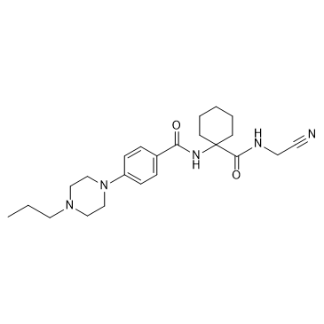 Balicatib (AAE581) is a potent, orally active and selective cathepsin K inhibitor with IC50 values of 22, 61, 48, 2900 nM for cathepsin K, cathepsin B, cathepsin L, cathepsin S, respectively. Balicatib inhibits bone turnover, decreases bone formation rates. Balicatib has the potential for the research of osteoporosis[1][2]. In Vitro: Balicatib (0-10 µM) shows less than 1.5-fold accumulation of Type I collagen at concentrations up to 10 µM in human dermal fibroblasts[2]. In Vivo: Balicatib (0, 3, 10, 50 mg/kg; Oral gavage; twice daily for 18 months) partially prevented ovariectomyinduced changes in bone mass, inhibited bone turnover at most sites, and had an stimulatory effect on periosteal bone formation in cynomolgus monkeys[1].