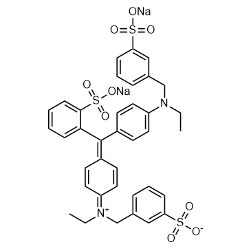 Brilliant Blue FCF is an aromatic hydrocarbon, a synthetic dye produced from petroleum and used as a colorant for food and other substances. The solution has a maximum absorption at 628 nm.