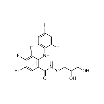 PD318088 is a potent, allosteric and non-ATP competitive MEK1/2 inhibitor, an analog of PD184352 (HY-50295). PD318088 binds simultaneously with ATP in a region of the MEK1 active site that is adjacent to the ATP-binding site. PD318088 can be used for cancer research[1]. IC50 & Target: MEK[1][2] In Vitro: PD318088 binds simultaneously with ATP in a region of the MEK1 active site that is adjacent to the ATP-binding site. Formation of the ternary complexes with PD318088 and MgATP results in moderate increases (to 140 nM) for the Kd monomer-dimer for both MEK1 and MEK2. The binding of PD318088 and MgATP to MEK1 also abolishes the formation of tetramers and higher-order aggregates[1].The mechanism of inhibition for PD318088 is probably a result of localized conformational changes in the active site and not a global change in the overall structure[1].