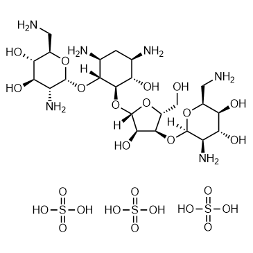 Framycetin sulfate (Neomycin B sulfate), an aminoglycoside antibiotic, is a potent RNase P cleavage activity inhibitor with a Ki of 35 μM. Framycetin sulfate competes for specific divalent metal ion binding sites in RNase P RNA. Framycetin sulfate inhibits hammerhead ribozyme with a Ki of 13.5 μM. Framycetin sulfate, a 5″-azido neomycin B precursor, binds the Drosha site in miR-525 and is used for hepatic encephalopathy and enteropathogenic E. coli infections[1][2].