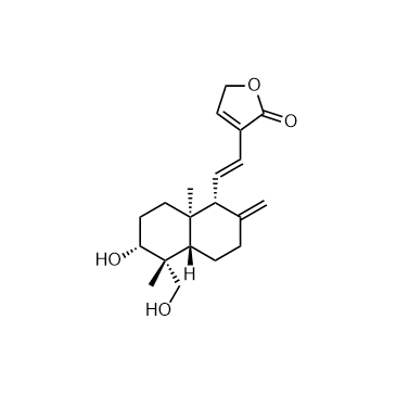 14-Deoxy-11,12-didehydroandrographolide is an analogue of Andrographolide. 14-Deoxy-11,12-didehydroandrographolide inhibits NF-κB activation. IC50 & Target: NF-κB[1] In Vitro: 14-deoxy-11,12-didehydroandrographolide, a naturally occurring noncytotoxic analogue of Andrographolide, effectively reduces Ovalbumin (OVA)-induced inflammatory cell recruitment into bronchoalveolar lavage (BAL) fluid, IL-4, IL-5, IL-13, and eotaxin production, serum IgE synthesis, pulmonary eosinophilia, mucus hypersecretion, mast cell degranulation, and airway hyper-responsiveness (AHR) in a mouse asthma model, probably via inhibition of NF-κB activity[1]. In Vivo: 14-deoxy-11,12-didehydroandrographolide (1 mg/kg) dramatically reduces resistance (Rl) and restores Cdyn in OVA-challenged mice in response to methacholine[1].