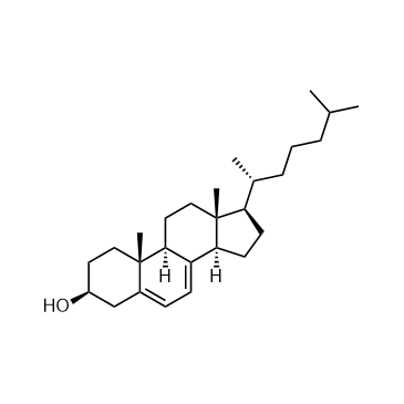 7-Dehydrocholesterol is biosynthetic precursor of cholesterol and vitamin D3. In Vitro:7-Dehydrocholesterol is a biosynthetic precursor of cholesterol and vitamin D3. 7-Dehydrocholesterol is present in relatively high concentration in skin where it is converted to pre-vitamin D3 upon UV irradiation and where it is also exposed to exogenous radical sources and oxygen[1].
