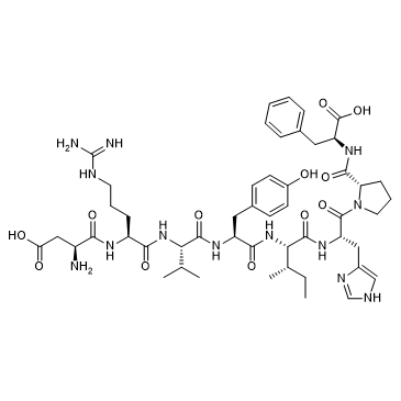 Angiotensin II (Angiotensin II) is a vasoconstrictor and a major bioactive peptide of the renin/angiotensin system. Angiotensin II human plays a central role in regulating human blood pressure, which is mainly mediated by interactions between Angiotensin II and the G-protein-coupled receptors (GPCRs) Angiotensin II type 1 receptor (AT1R) and Angiotensin II type 2 receptor (AT2R). Angiotensin II human stimulates sympathetic nervous stimulation, increases aldosterone biosynthesis and renal actions. Angiotensin II human induces growth of vascular smooth muscle cells, increases collagen type I and III synthesis in fibroblasts, leading to thickening of the vascular wall and myocardium, and fibrosis. Angiotensin II human also induces apoptosis. Angiotensin II induces capillary formation from endothelial cells via the LOX-1 dependent redox-sensitive pathway[1][2][3][4].