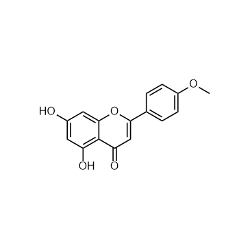 Acacetin (5,7-Dihydroxy-4'-methoxyflavone) is an orally active flavonoid derived from Dendranthema morifolium. Acacetin docks in the ATP binding pocket of PI3Kγ. Acacetin causes cell cycle arrest and induces apoptosis and autophagy in cancer cells. Acacetin has potent anti-cancer and anti-inflammatory activity and has the potential for pain-related diseases research[1][2].