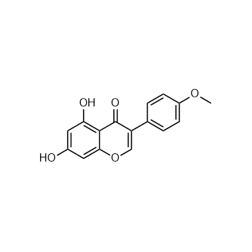 Biochanin A is a naturally occurring fatty acid amide hydrolase (FAAH) inhibitor, which inhibits FAAH with IC50s of 1.8, 1.4 and 2.4 μM for mouse, rat, and human FAAH, respectively. IC50 & Target:IC50: 1.8 μM (mouse FAAH), 1.4 μM (rat FAAH), 2.4 μM (human FAAH)[1] In Vitro: Biochanin A inhibits the hydrolysis of 0.5 μM AEA by mouse, rat and human FAAH with IC50 s of 1.8, 1.4 and 2.4 μM respectively. FAAH is inhibited by Biochanin A with a pIC50 value of 6.21±0.02, corresponding to an IC50 value of 0.62 μM. Biochanin A produces significant inhibition of the URB597-sensitive tritium retention at high nanomolar-low micromolar concentrations. Experiments are run with human FAAH and 0.5 μM [3H]AEA with assay conditions giving these higher utilization rates, the activity is still inhibited by Biochanin A, Genistein, Formononetin and Daidzein in the low micromolar range (IC50s of 6.0, 8.4, 12 and 30 μM, respectively)[1]. In Vivo: Biochanin A is tested at doses of 30, 100 and 300 μg. The highest dose also reduced formalin-induced ERK phosphorylation in a manner antagonized by AM251. Thus, Biochanin A behaved like URB597 after local administration to the paw. In anaesthetized mice, URB597 (30 μg i.pl.) and Biochanin A (100 μg i.pl.) both inhibit the spinal phosphorylation of extracellular signal-regulated kinase produced by the intraplantar injection of formalin. The effects of both compounds are significantly reduced by the CB1 receptor antagonist/inverse agonist AM251 (30 μg i.pl.). Biochanin A (15 mg/k i.v.) does not increase brain AEA concentrations, but produces a modest potentiation of the effects of 10 mg/kg i.v. AEA in the tetrad test. Biochanin A (15 mg/kg i.v.) is without effects on its own, but significantly potentiates the effects of AEA (10 mg/kg i.v.)[1].
