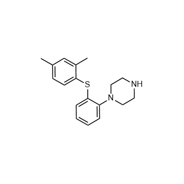 Vortioxetine (Lu AA 21004) is a inhibitor of 5-HT1A, 5-HT1B, 5-HT3A, 5-HT7 receptor and SERT, with Ki values of 15 nM, 33 nM, 3.7 nM, 19 nM and 1.6 nM, respectively. IC50 & Target: Ki: 15 nM (5-HT1A); 33 nM (5-HT1B); 3.7 nM (5-HT3A); 19 nM (5-HT7); 1.6 nM (SERT)[1]. In Vitro: Vortioxetine (Compound 5m) is a multimodal serotonergic agent, inhibits 5-HT1A, 5-HT1B, 5-HT3A, 5-HT7 receptor and SERT with Ki values of 15 nM, 33 nM, 3.7 nM, 19 nM and 1.6 nM, respectively. Vortioxetine displays antagonistic properties at 5-HT3A and 5-HT7 receptors, partial agonist properties at 5-HT1B receptors, agonistic properties at 5-HT1A receptors, and potent inhibition of SERT[1]. Vortioxetine is a partial h5-HT 1B receptor agonist with EC50 of 460 nM and intrinsic activity of 22% using a whole-cell cAMP-based assay. Vortioxetine binds to the r5-HT 7 receptor with a Ki value of 200 nM and is a functional antagonist at the r5-HT7 receptor with an IC50 of 2 μM in an in vitro whole-cell cAMP assay[5]. In Vivo: Vortioxetine (Lu AA21004) occupies the r5-HT1B receptor and rSERT (ED50= 3.2 and 0.4 mg/kg, respectively) after subcutaneous administration and is a 5-HT3 receptor antagonist[6]. Vortioxetine significantly increases cell proliferation and cell survival and stimulates maturation of immature granule cells in the sub granular zone of the dentate gyrus of the hippocampus after 21 days of treatment[3]. Vortioxetine does not cause cognitive or psychomotor impairment[4].