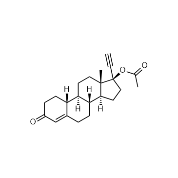 Norethindrone acetate is a female hormone used for the research of endometriosis[1]. Norethindrone acetate is a click chemistry reagent, itcontains an Alkyne group and can undergo copper-catalyzed azide-alkyne cycloaddition (CuAAc) with molecules containing Azide groups. IC50 & Target: Progesterone Receptor[1] In Vivo: Norethindrone acetate could be a cost-effective alternative with relatively mild side effects in the treatment of symptomatic endometriosis. Subjects treated with norethindrone acetate obtain dysmenorrhea and noncyclic pelvic pain relief[1]. Norethindrone acetate alone is a well-tolerated, effective option to manage pain and bleeding for all stages of endometriosis. Post-Norethindrone acetate bleeding scores are improved regardless of prior hormonal regimen, and post-Norethindrone acetate pain scores improved in all patients except for those previously prescribed GnRH-agonist plus add-back[2]. Norethindrone acetate shows low acute toxicity in experimental animals and is consistent with the lack of toxicity seen in humans. Administration of norethindrone acetate alone to rodents at several multiples of the human dose results in no treatment related mortality, hematological changes, behavioral changes, or organ pathology[3]. Norethindrone acetate administration leads to significant and proportional reductions of the concentrations of triglycerides, cholesterol and phospholipids of plasma lipoproteins of density <1.006 of rats fed a high carbohydrate diet. Norethindrone acetate (0.1 mM) also significantly inhibits the incorporation of both palmitate and glycerol into triglycerides of isolated hepatocytes from fed rats[4].