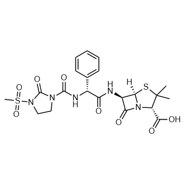 Mezlocillin (BAY-f 1353) is a β-lactam antibiotic, a semisynthetic and extended-spectrum antibiotic. Mezlocillin is active against both gram-negative and gram-positive bacteria. Mezlocillin can be used in bacterial infection research[1][2]. In Vivo:Mezlocillin (subcutaneous injection; 1.7-5.7 mg/kg; twice daily; 7 d) treatment in vivo suppresses the IgM and IgG responses and the delayed-type hypersensitivity reaction, observes the loss of hair, and inhibits lymphocyte proliferation of animals treated with all doses[1].