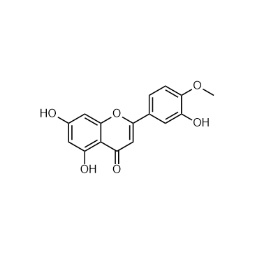 Diosmetin is a natural flavonoid which inhibits human CYP1A enzyme activity with an IC50 of 40 μM in HepG2 cell. IC50 & Target: IC50: 40 μM (Others, HepG2 cell)[1] In Vitro: Diosmetin inhibits cell proliferation in HepG2 cells in a concentration-dependent manner. Untreated HepG2 cells grow well and are observed to have with normal skeletons, whereas cells treated with diosmetin are distorted and a number of them become round and floating[1]. In Vivo: Pretreatment with diosmetin significantly reduces serum levels of amylase and lipase; the histological injury; the secretion of tumor necrosis factor (TNF)-α, interleukin (IL)-1β, and IL-6; myeloperoxidase (MPO) activity, trypsinogen activation peptide (TAP) level, the expression of inducible nitric oxide synthase (iNOS); and the nuclear factor (NF)-κB activation in cerulein-induced acute pancreatitis[2].