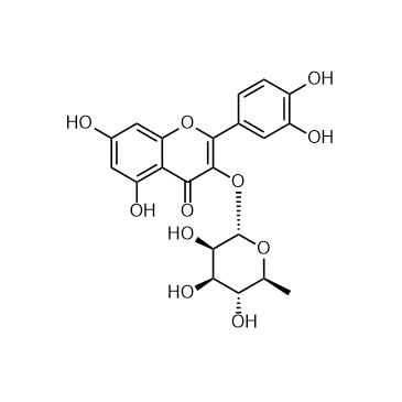 Quercitrin (Quercetin 3-rhamnoside) is a bioflavonoid compound with potential anti-inflammation, antioxidative and neuroprotective effect. Quercitrin induces apoptosis of colon cancer cells. Quercitrin can be used for the research of cardiovascular and neurological disease research[1][2]. In Vitro:Quercitrin (5-50 μM; 24-72 h) time- and dose-dependently inhibits cell proliferation and increases cytotoxic effects to colorectal carcinoma cells[1]. Quercitrin (5-50 μM; 24-72 h) time- and dose-dependently increases nucleosomal enrichment factor (EF) of DLD-1 cells[1]. Quercitrin (50 μM; 48-72 h) induces cell apoptosis and the loss of mitochondrial membrane potential, and causes translocation of phosphatidylserine (PS) from the inner to outer Leaflet of DLD-1 cells[1]. In Vivo:Quercitrin (50 and 100 mg/kg; oral gavage, once) shows effective protection against brain injury in mice by inhibiting oxidative stress and inflammation induced by carbon tetrachloride[2].