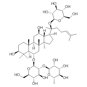 In Vivo: Ginsenoside Re reduces insulin resistance in 3T3-L1 adipocytes and high-fat diet (HFD) rats through inhibition of JNK and NF-κB activation[2]. Intraperitoneal injection of lipopolysaccharide (LPS) at a dose of 20 mg/kg is lethal to mice, and 70% to 80% of the mice die within 60 h. However, pretreatment of the mice with Rg1 or Ginsenoside Re increases their survival rates in a dose-dependent manner. With the doses of Rg1 or Ginsenoside Re increase from 2.5 to 5 mg/kg, the survival rate is elevated from 60% to 90% (Rg1) or from 30% to 40% (Ginsenoside Re). All the mice administered Rg1 at a minimal dose of 10 mg/kg are protected from death compared to 80% survival of mice treated with an equal dose of Ginsenoside Re. To protect all the mice, 20 mg/kg Ginsenoside Re is needed. To investigate the anti-inflammatory potential of Rg1 and Ginsenoside Re, 1 mg/kg Rg1 or Ginsenoside Re is injected into rats and then challenged the animals with LPS. The injection procedure itself causes a transient stress-induced increase in body temperature of ~1.2°C in each group. Thereafter, LPS-challenged rats without pretreatment develope a robust biphasic fever, with the first peak reaching ~1.5°C at 2 h and the second peak reaching 1.8°C at 4 h. In contrast, the temperature changes for the Rg1-, Ginsenoside Re-, and TAK-242-treated groups are only 0.9, 1.2, and 0.8°C at 2 h and 1.3, 1.4, and 1.0°C at 4 h, respectively. Pretreatment with Rg1, Ginsenoside Re, or TAK-242 significantly attenuates LPS-induced alterations in body temperature[3].