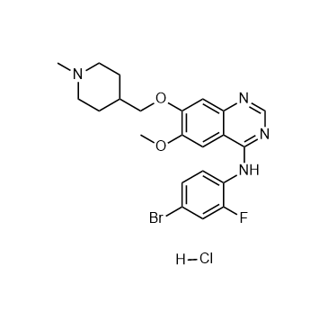 Vandetanib hydrochloride (D6474 hydrochloride) is a potent, orally active inhibitor of VEGFR2/KDR tyrosine kinase activity (IC50=40 nM). Vandetanib hydrochloride also has activity versus the tyrosine kinase activity of VEGFR3/FLT4 (IC50=110 nM) and EGFR/HER1 (IC50=500 nM)[1]. IC50 & Target: IC50: 40 nM (VEGFR2) In Vitro: Vandetanib inhibits VEGFR3 and EGFR with IC50 of 110 nM and 500 nM, respectively. Vandetanib is not sensitive to PDGFRβ, Flt1, Tie-2 and FGFR1 with IC50 of 1.1-3.6 μM, while almost has no activity against MEK, CDK2, c-Kit, erbB2, FAK, PDK1, Akt and IGF-1R with IC50 above 10 μM. Vandetanib inhibits VEGF-, EGF- and bFGF-stimulated HUVEC proliferation with IC50 of 60 nM, 170 nM and 800 nM, with no effect on basal endothelial cell growth. Vandetanib inhibits tumor cell growth with IC50 of 2.7 μM (A549) to 13.5 μM (Calu-6)[1]. Odanacatib is a weak inhibitor of antigen presentation, measured in a mouse B cell line (IC50=1.5±0.4 μM), compared to the Cat S inhibitor LHVS (IC50=0.001 μM) in the same assay. Odanacatib also shows weak inhibition of the processing of the MHC II invariant chain protein Iip10 in mouse splenocytes compared to LHVS (minimum inhibitory concentration 1-10 μM versus 0.01 μM, respectively)[2]. Vandetanib suppresses phosphorylation of VEGFR-2 in HUVECs and EGFR in hepatoma cells and inhibits cell proliferation[4]. In Vivo: Vandetanib (15 mg/kg, p.o.) has a superior anti-tumor effect than gefitinib in the H1650 xenograft model, and suppresses tumor growth with IC50 of 3.5±1.2 μM[3]. In tumor-bearing mice, vandetanib (50 or 75 mg/kg) suppresses phosphorylation of VEGFR-2 and EGFR in tumor tissues, significantly reduces tumor vessel density, enhances tumor cell apoptosis, suppresses tumor growth, improves survival, reduces number of intrahepatic metastases, and upregulates VEGF, TGF-α, and EGF in tumor tissues[4].
