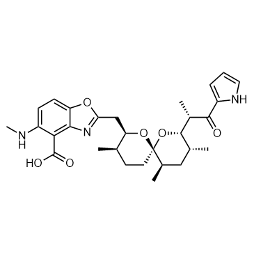 Calcimycin (A-23187) is an antibiotic and a unique divalent cation ionophore (like calcium and magnesium). Calcimycin induces Ca2+-dependent cell death by increasing intracellular calcium concentration. Calcimycin inhibits the growth of Gram-positive bacteria and some fungi. Calcimycin also inhibits the activity of ATPase and uncouples oxidative phosphorylation (OXPHOS) of mammalian cells. Calcimycin induces apoptosis and autophagy[1][2][3][4][5]. In Vitro:Calcimycin (A-23187) mediates mycobacterial killing by inducing intracellular calcium-regulated autophagy in a P2RX7 dependent manner[4]. In Vivo:Calcimycin (A-23187) (2.5 or 7.5 nM; intrapleurally) induces protein leakage[5].