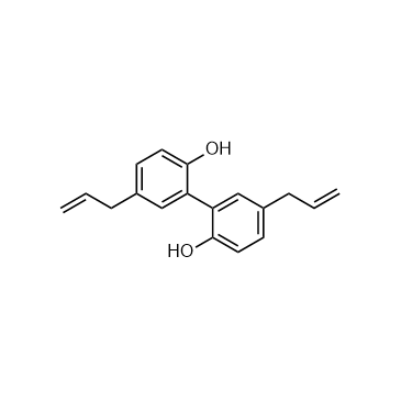 Magnolol, a natural lignan isolated from the stem bark of Magnolia officinalis, is a dual agonist of both RXRα and PPARγ, with EC50 values of 10.4 µM and 17.7 µM, respectively. IC50 & Target:EC50: 10.4 µM (RXRα), 17.7 µM (PPARγ)[1] In Vitro:Magnolol is a dual agonist of both RXRα and PPARγ, with EC50 values of 10.4 μM and 17.7 μM, respectively. Magnolol (26.2-80 μM) binds to RXRαLBD and PPARγLBD in a dose dependent manner, with Kd values of 45.7 μM and 1.67 μM, respectively. Magnolol (1-20 μM) induces the transcription of PPRE in a dose-dependent manner, but shows no activity on RXRE transcription[1]. Magnolol (1, 3, 10 μM) enhances adipocyte differentiation of both 3T3-L1 pre-adipocystes and C3H10T1/2 pluripotent stem cells in the presence of insulin. Magnolol (10 μM) upregulates mRNA expression of marker genes for adipocyte differentiation. Magnolol (1, 10 μM) shows an increase in basal and insulin-stimulated glucose uptake in differentiated 3T3-L1 adipocytes[2]. In Vivo:Magnolol (5-15 mg/kg, p.o.) significantly attenuates the phenotypic severity of dextran sulfate sodium (DSS)-induced colitis in mice. Magnolol (10, 15 mg/kg, p.o.) attenuates histopathological changes and myeloperoxidase activity in the colon of DSS-treated mice, decreases DSS-induced high levels of proinflammatory cytokines TNF-α, IL-1β and IL-6 in the colonic tissues. Magnolol (10 mg/kg, p.o.) also reverses abnormality of serum metabolome, and regulates tryptophan metabolic pathway in mice[3].