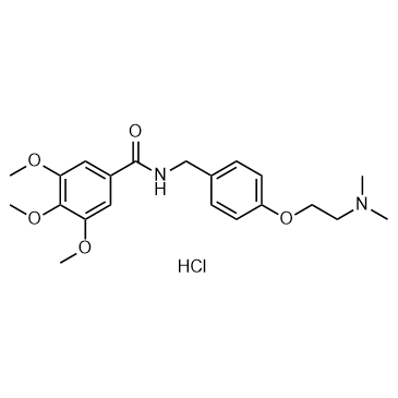 Trimethobenzamide hydrochloride is a blocker of the D2 receptor. Trimethobenzamide is an antiemetic used to prevent nausea and vomiting. IC50 & Target: D2 receptor[1] In Vitro: Trimethobenzamide is a (non-phenothiazine) benzamide antiemetic that acts centrally to block D2 receptors, thereby inhibiting the medullary chemoreceptor trigger zone by blocking emetic impulses to the vomiting center[1]. In Vivo: The oral bioavailability of Trimethobenzamide is 60% to 100%. The time to peak is about 45 minutes after oral administration and; Intramuscular (I.M.) administration about 30 minutes after intramuscular administration[1].