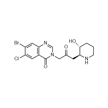 Halofuginone (RU-19110), a Febrifugine derivative, is a competitive prolyl-tRNA synthetase inhibitor with a Ki of 18.3 nM[1][2]. Halofuginone is a specific inhibitor of type-I collagen synthesis and attenuates osteoarthritis (OA) by inhibition of TGF-β activity[3][4]. Halofuginone is also a potent pulmonary vasodilator by activating Kv channels and blocking voltage-gated, receptor-operated and store-operated Ca2+ channels. Halofuginone has anti-malaria, anti-inflammatory, anti-cancer, anti-fibrosis effects[5]. IC50 & Target:Ki: 18.3±0.5 nM (prolyl-tRNA synthetase)[2] In Vitro: Halofuginone competitively inhibits prolyl-tRNA synthetase by occupying both the prolineand tRNA-binding pockets of prolyl-tRNA synthetase[1].