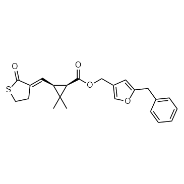 Kadethrin is a synthetic pyrethroid that acts as an insecticide. Kadethrin can affect the binding of [3H] full-histamine toxin ([3H]H12-HTX) to the nicotinic acetylcholine (Ach) receptor/channel binding sites, and it inhibits the Ca2+ flux through the receptor ion channels[1].