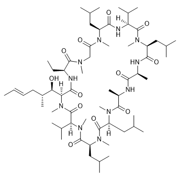 Cyclosporin A suppresses the nuclear translocation of NF-AT[4]. Cyclosporin A shows an effect on mitochondria via preventing the MTP from opening with an IC50 of 39 nM[5].