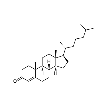 Cholestenone (4-cholesten-3-one) is an orally available antimicrobial agent that is metabolized primarily in the liver as an intermediate oxidation product of cholesterol. Cholestenone inhibits human dermal fibroblast migration and fights Helicobacter pylori infection in vitro and in mouse models by inhibiting cholesterol-α-D-glucopyranoside (CGL). Cholestenone also alleviates metabolic disorders caused by obesity in db/db mice[1][2][3][4].