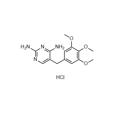 Trimethoprim hydrochloride is a bacteriostatic antibiotic and an orally active dihydrofolate reductase inhibitor. Trimethoprim hydrochloride is active against a wide range of Gram-positive and Gram-negative aerobic bacteria. Trimethoprim hydrochloride has the potential for the research of urinary tract infections, Shigellosis and Pneumocystis pneumonia. Trimethoprim hydrochloride can inhibit infection of Influenza A virus in chick embryo when combinated with zinc[1][2][3][4].