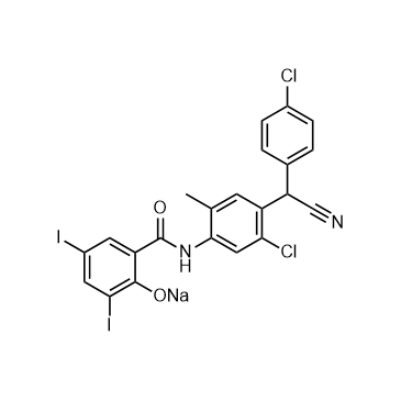 Closantel sodium is a halogenated salicylanilide with a potent anti-parasitic activity. Closantel sodium is a potent and highly specific Onchocerca volvulus chitinase (OvCHT1) inhibitor with an IC50 of 1.6 μM and a Ki of 468 nM. Closantel sodium inhibits the O. volvulus L3 to L4 molt of developing[1][2].