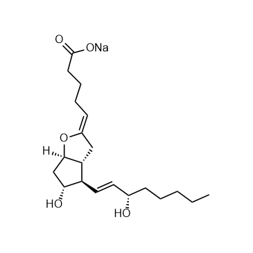 Epoprostenol sodium (Prostaglandin I2) sodium salt, the synthetic form of the natural prostaglandin derivative prostacyclin (prostaglandin I2), is registered worldwide for the treatment of Pulmonary arterial hypertension (PAH). Epoprostenol sodium is used in pulmonary hypertension and transplantation as a potent inhibitor of platelet aggregation[1][2][3]. In Vitro:Epoprostenol (1.0 ng/mL; 24 h) sodium induces apoptosis in PAH-PASMCs by upregulating the expression of IP receptor and Fas ligand (FasL)[3].