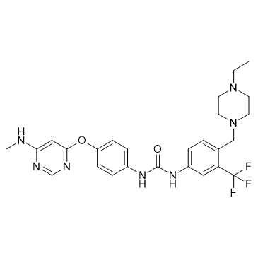 AST 487 is a RET kinase inhibitor with IC50 of 880 nM, inhibits RET autophosphorylation and activation of downstream effectors, also inhibits Flt-3 with IC50 of 520 nM. IC50 & Target: IC50: 880 nM (RET), 170 nM (KDR), 790 nM (Flt-4), 500 nM (c-Kit), 520 nM (Flt-3), 20 nM (Abl)[1] In Vitro: A number of other kinases are also similarly inhibited by AST 487 (NVP-AST487) in the in vitro kinase assays, including KDR (IC50=170 nM), Flt-4 (IC50=790 nM), Flt-3 (IC50=520 nM), c-Kit (IC50=500 nM), and c-Abl (IC50=20 nM). AST 487 potently inhibits the growth of human thyroid cancer cell lines with activating mutations of RET but not of lines without RET mutations. Both GDNF/GFRα1 and persephin-induced calcitonin mRNA are markedly inhibited by coincubation with 100 nM of AST 487 in MTC-M cells[1]. AST 487 is a novel, mutant FLT3 inhibitor. AST 487 is tested in biochemical assays for inhibition of Flt-3 kinase activity. The Ki is determined to be 0.12 μM. Besides Flt-3, NVP-AST487 inhibits RET, KDR, c-Kit, and c-Abl kinase with IC50 values below 1 μM. Treatment of FLT3-ITD-Ba/F3 cells and D835Y-Ba/F3 cells with AST 487 potently inhibits cellular proliferation (IC50<5 nM). AST 487 treatment of FLT3-ITD-Ba/F3 cells with 0.01 μM AST 487 results in complete cell killing compare with approximately 50% killing of AML patient samples at the same concentration[2]. In Vivo: After a single oral administration of 15 mg/kg of AST 487 to OF1 mice, a mean peak plasma level (Cmax) of 0.505±0.078 μM SE is achieved after 0.5 h. Similar levels of AST 487 are found in the plasma of mice up to 6 h after oral administration, with a Clast of 21±4 nM at 24 h. The oral bioavailability is calculated to be 9.7% with a t1/2 terminal elimination of 1.5 h[1].