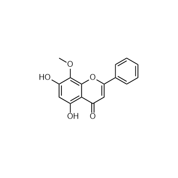 Wogonin is a naturally occurring mono-flavonoid, can inhibit the activity of CDK8 and Wnt, and exhibits anti-inflammatory and anti-tumor effects. IC50 & Target: CDK8, Wnt[1], CDK4[2] In Vitro: Wogonin (0-200 μM) exhibits a dose- and time- dependent reduces in cell viability of caco-2, SW1116 and HCT116 cells. Wogonin (10-40 μM) induces G1 phase arrest in HCT-116 cells. Wogonin also supresses Wnt signaling pathway in HCT116 cells. Wogonin interfers in the activity of transcription factor TCF/Lef family. Moreover, Wogonin inhibits β-catenin-mediated transcription through suppressing the activity of CDK8[1]. Wogonin shows cytotoxic and antiproliferative effects on HeLa cells. Wogonin (90 µM) induces cell cycle arrest at G0-G1 phase, and suppresses the levels of cyclin D1 and Cdk4 markedly in HeLa cells[2]. Wogonin (1.25, 2.5, 5, 10, 20 μg/ml) suppresses EtOH-induced inflammatory response in RAW264.7 cells[3]. In Vivo: Wogonin (30, 60 mg/kg) reduces tumor growth of HCT116 cells in a xenograft model[1]. Wogonin (25, 50, 100 mg/kg) protects against liver injury and pathological characteristics of ALD in mice. Wogonin activates PPAR-γ expression in mice with ALD and EtOH induced RAW264.7 cells[3].