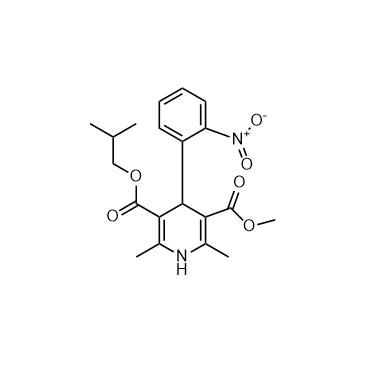 Nisoldipine (BAY-k 5552; Sular) is an orally active and blood-brain barrier-penetrating dihydropyridine calcium antagonist, with greater vascular selectivity than other calcium channel antagonists. Nisoldipine inhibits calcium influx and blocks voltage-gated calcium channels. Nisoldipine dilates coronary and systemic arteries. Nisoldipine has antihypertensive and anti-anginal activity. Nisoldipine also displays neuroprotective and antiviral activity[1][2][7][11].