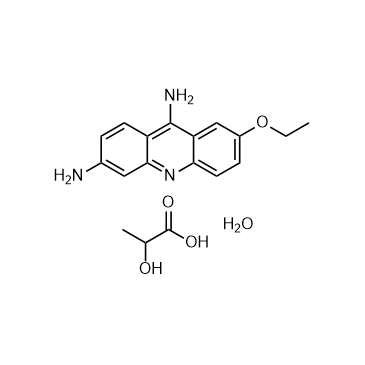Ethacridine lactate (Acrinol) monohydrate is a widely used antiseptic and abortifacient. Ethacridine lactate monohydrate is effective against Staphylococcus aureus and other gram-positive cocci. Ethacridine lactate monohydrate is also a poly(ADP-ribose) glycohydrolase (PARG) inhibitor[1][2][3]. IC50 & Target: poly(ADP-ribose) glycohydrolase (PARG)[2] In Vitro: Acrinol is effective against S. aureus including MRSA, with the MICs ranging from 100-200 μg/mL. The MIC of Acrinol for Eschericia coli is 200-800 μg/mL, and it is over 1,600 μg/mL for Proteus vulgaris and Proteus mirabilis[3]. In Vivo: Ethacridine lactate can be used for termination of pregnancy[1].