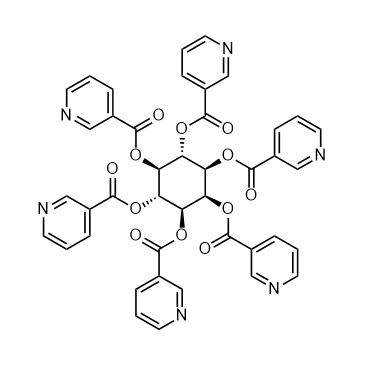 Inositol nicotinate (Hexanicit) has vasodilating effects and can be used in research on peripheral arterial disease, showing efficacy when taken orally. Inositol nicotinate does not significantly improve triglyceride levels in mice induced by biphenyl esters[1][2]. In Vivo:Inositol nicotinate (0.1-0.3 g/kg, oral , once a day, four days) shows no significant improvement in biphenyl ester-induced hypertriglyceridemia in mice[1].