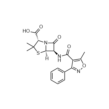 In Vitro:Oxacillin inhibits gram positive pathogens with MICs of 0.05, 0.09, 0.32 and 0.80 μg/mL against group A streptococci, Pneutnococci, susceptible staphylococci and penicillin-resistant staphylococci, respectively[1].