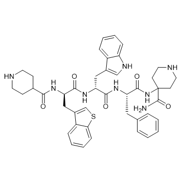 Relamorelin (RM-131), a pentapeptide ghrelin analog, is a selective ghrelin/growth hormone secretagogue receptor (GHSR) agonist with a Ki of 0.42 nM for GHS-1a receptor. Relamorelin is centrally penetrant. Relamorelin increases growth hormone levels and accelerates gastric emptying. Relamorelin has the potential for cachexia, gastroparesis, and gastric/intestinal dysmobility disorders research[1][2][3][4].