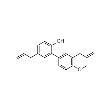 4-O-Methyl honokiol is a natural neolignan isolated from Magnolia officinalis, acts as a PPARγ agonist, and inhibtis NF-κB activity, used for cancer and inflammation research. IC50 & Target:PPARγ, NF-κB[1] In Vitro: 4-O-Methyl honokiol is a natural neolignan isolated from Magnolia officinalis, acts as a PPARγ agonist, and inhibtis NF-κB activity. 4-O-Methyl honokiol (20 μM) increases the expression, transcription and DNA binding activities, and nuclear translocation of PPARγ in both in prostate PC-3 and LNCap cells. 4-O-Methyl honokiol (0-30 μM) inhibits LNCaP and PC-3 cancer cells growth, causes G0/G1 phase arrest and induces apoptotic cell death, and such effects can be reversed by PPARγ antagonist. 4-O-Methyl honokiol inhibits NF-κB activity and cancer cell growth, but such effects as well as its activation of PPARγ can be abolished by knock-down of p21[1]. 4-O-methylhonokiol (0.5, 1 and 2 μM) reduces LPS-induced release of NO, PGE2, ROS, TNF-α and IL-1β in cultured astrocytes, and amyloidogenesis in cultured astrocytes and microglial BV-2 cells[2]. In Vivo: 4-O-Methyl honokiol (40 or 80 mg/kg, i.p. everyday for 4 weeks) inhibits the growth of SW620 and PC3 tumours in SW620 and PC3 xenograft model. 4-O-Methyl honokiol significantly increases the expression of p21 and PPARγ in the tumour tissues[1]. 4-O-Methyl honokiol (0.5 or 1 mg/kg/day daily for 3 weeks) significantly ameliorates LPS-induced memory impairment, and inhibits LPS-induced iNOS and COX-2 expression in mice. 4-O-Methyl honokiol also shows inhibitory activities against the Aβ1-42 accumulation, and activates astrocytes and microglia in LPS-injected mice brain[2].