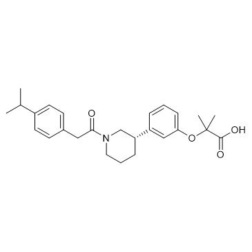 CP-775146 is a selective PPARα agonist (Ki of 24.5 nM) that binds strongly to the PPARα ligand. CP-775146 has no observable affinity for PPARβ and PPARγ.CP-775146 shows hypolipidemic activity. CP-775146 efficiently alleviates obesity-induced liver damage, prevents lipid accumulation by activating the liver fatty acid β-oxidation pathway[1][2]. In Vitro:CP-775146 induces PPARα transcriptional activity in a reporter assay, the EC50s of 57 nM and 284 nM for human and rat receptors, respectively, expressed in HepG2 cells[1] In Vivo:CP-775146 (0.1-0.3 mg/kg; i.p.; daily; for 3 days) efficiently alleviates obesity-induced liver damage, prevents lipid accumulation by activating the liver fatty acid β-oxidation pathway, and regulates the expression of genes that control brown fat-like pathway in eWAT[2].